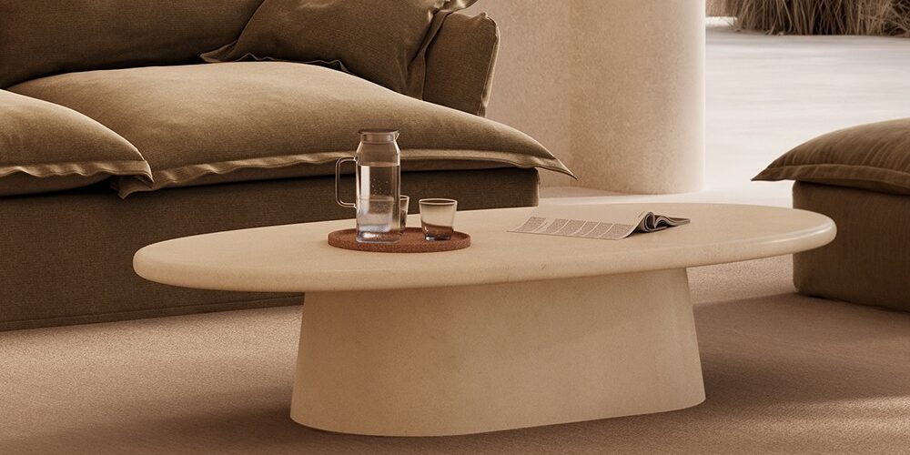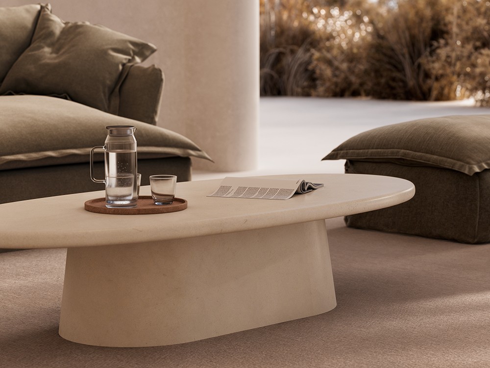 La mesa de centro Ganges, con una geometría baja y alargada, de líneas redondeadas, cuenta con un revestimiento continuo de microcemento, sin juntas,  similar a la piedra con acabado mate natural. Aporta carácter a interiores modernos mediterráneos, wabi-sabi o industrial. La mesa de centro Indo presenta una forma orgánica de líneas suaves y redondeadas, con dos niveles de apoyo que se integran a la perfección, uno en color natural y el otro en color gris. Con un revestimiento de microcemento continuo de acabado mate tipo piedra.